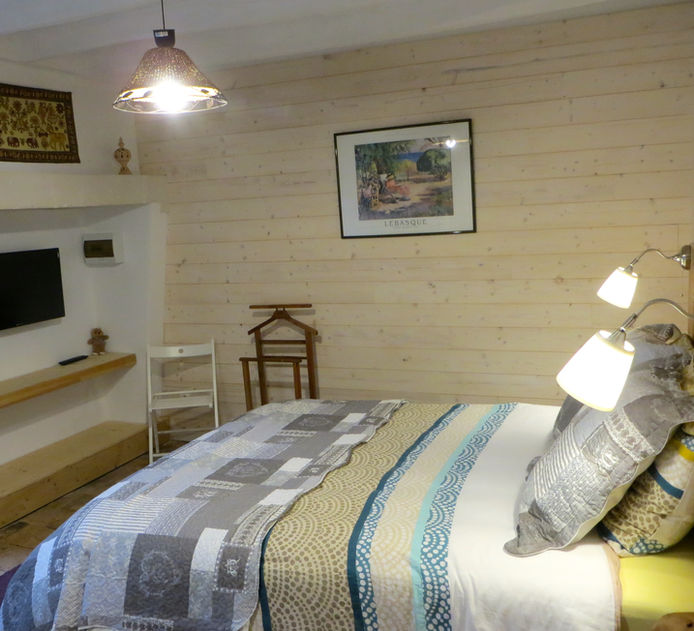 Elle comprend un grand lit (largeur 160 cm) avec un coin kitchenette vous permettant d'y préparer votre petit déjeuner. Il y a un petit réfrigérateur , un four à micro-ondes, une bouilloire, une cafetière et un grille-pains. Nous mettons à votre disposition du thé, café et infusions bio, sucre en morceau, sel, poivre et essuie-tout.